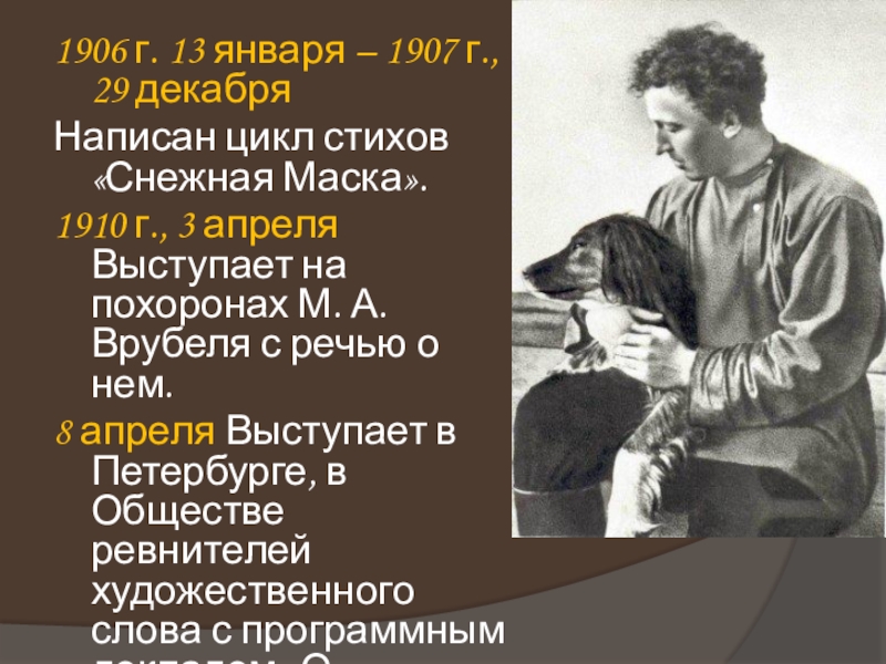 8 апреля Выступает в Петербурге, в Обществе ревнителей художественного слова с программным докладом «О современном состоянии русского символизма».