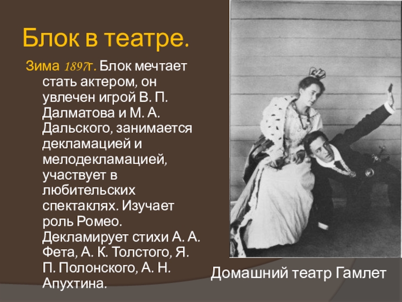 Слайд 13Зима 1897г. Блок мечтает стать актером, он увлечен игрой В. П.