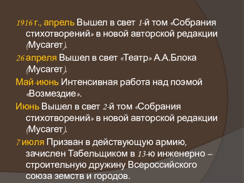 Слайд 441916 г., апрель Вышел в свет 1-й том «Собрания стихотворений» в