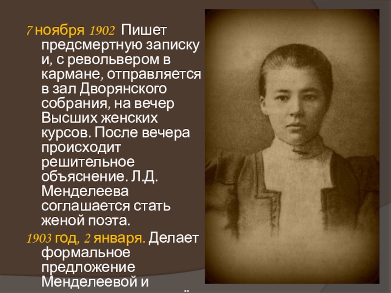 1903 год, 2 января. Делает формальное предложение Менделеевой и получает согласие её родителей на брак.