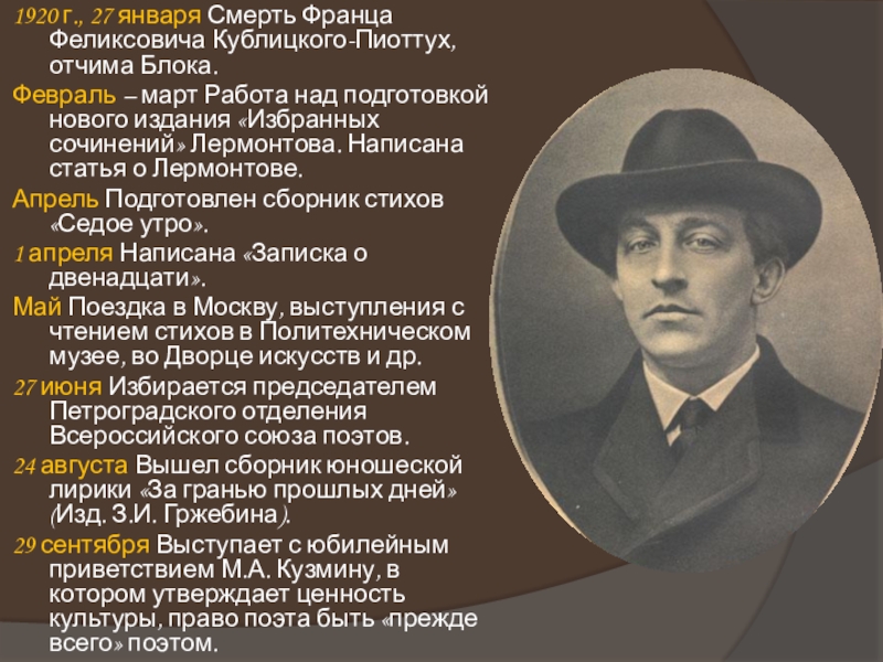 Слайд 521920 г., 27 января Смерть Франца Феликсовича Кублицкого-Пиоттух, отчима Блока.
