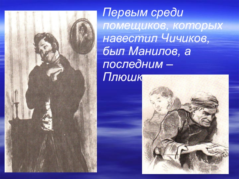Слайд 30 Первым среди помещиков, которых навестил Чичиков, был Манилов, а