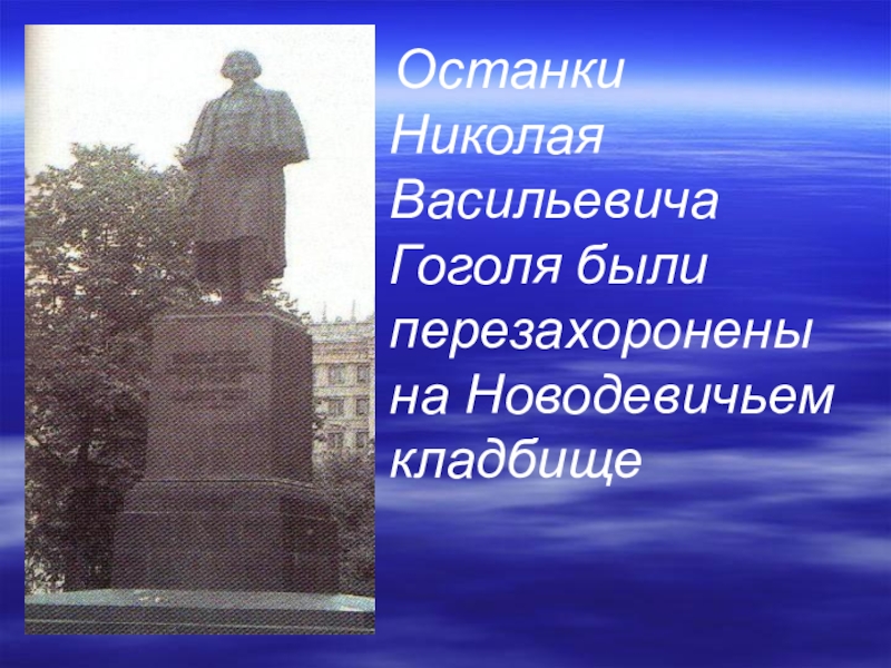 Слайд 40 Останки Николая Васильевича Гоголя были перезахоронены на Новодевичьем кладбище