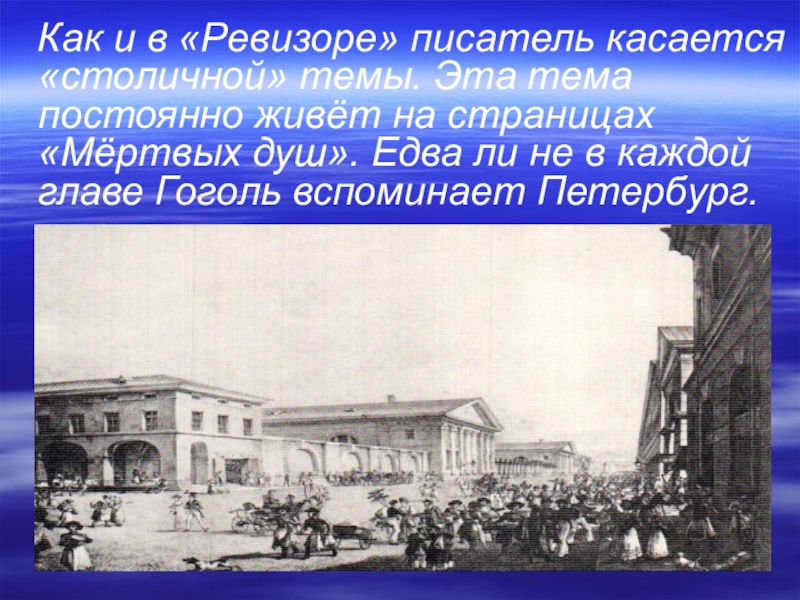 тема постоянно живёт на страницах «Мёртвых душ». Едва ли не в каждой главе Гоголь вспоминает Петербург.