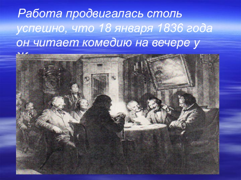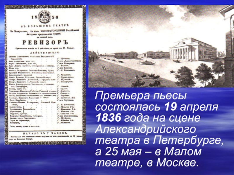 Слайд 20 Премьера пьесы состоялась 19 апреля 1836 года на сцене