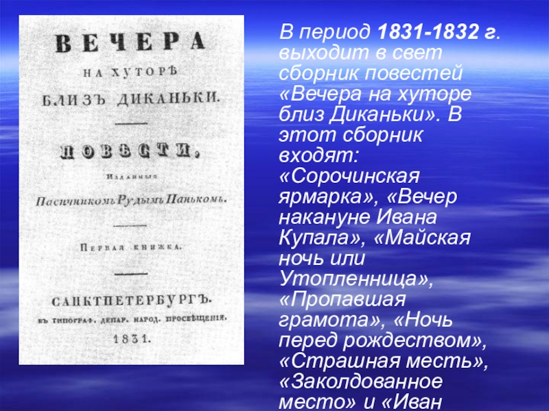 в свет сборник повестей «Вечера на хуторе близ Диканьки». В этот сборник входят: «Сорочинская ярмарка», «Вечер накануне Ивана Купала», «Майская ночь или Утопленница», «Пропавшая грамота», «Ночь перед рождеством», «Страшная месть», «Заколдованное место» и «Иван Фёдорович Шпонька и его тётушка».