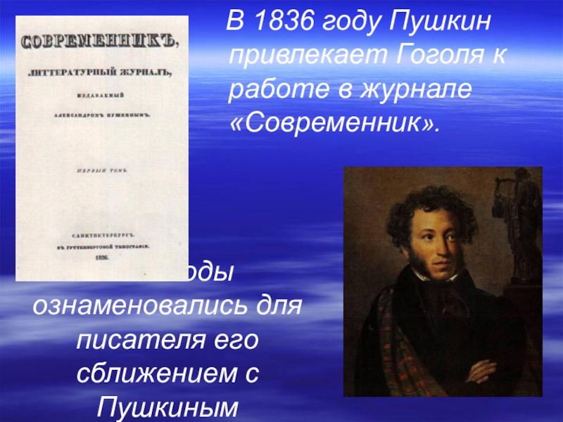 В 1836 году Пушкин привлекает Гоголя к работе в журнале «Современник».