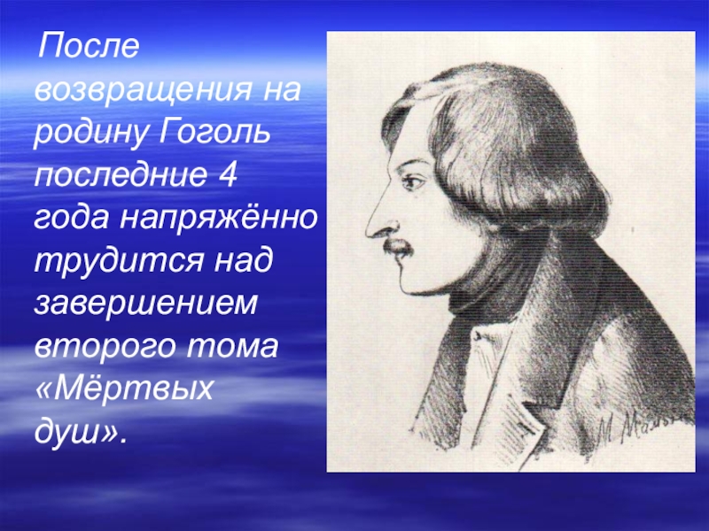 Слайд 35 После возвращения на родину Гоголь последние 4 года напряжённо