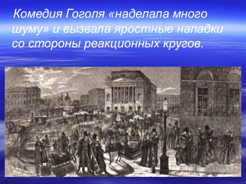 Слайд 21 Комедия Гоголя «наделала много шуму» и вызвала яростные нападки