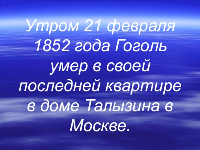 Слайд 38Утром 21 февраля 1852 года Гоголь умер в своей последней квартире