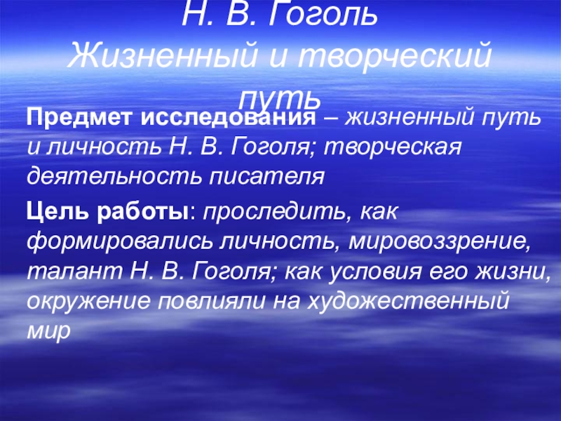 Цель работы: проследить, как формировались личность, мировоззрение, талант Н. В. Гоголя; как условия его жизни, окружение повлияли на художественный мир