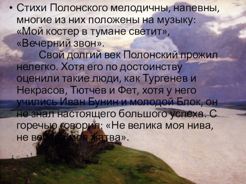 костер в тумане светит», «Вечерний звон». Свой долгий век Полонский прожил нелегко. Хотя его по достоинству оценили такие люди, как Тургенев и Некрасов, Тютчев и Фет, хотя у него учились Иван Бунин и молодой Блок, он не знал настоящего большого успеха. С горечью говорил: «Не велика моя нива, не весела моя жатва».