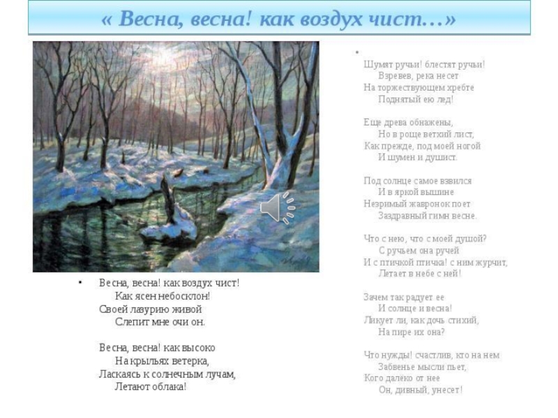 Не то, что мните вы, природа –Не слепок, не бездушный лик.В ней есть душа, в ней есть свобода,В ней есть любовь, в ней есть язык.Ф.И. Тютчев.