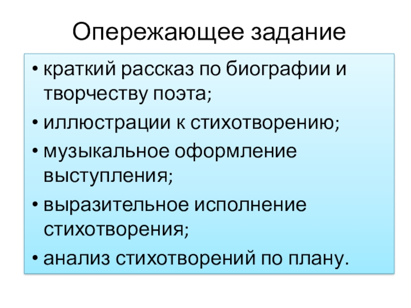 Опережающее задание краткий рассказ по биографии и творчеству поэта; иллюстрации к стихотворению; музыкальное оформление выступления; выразительное исполнение