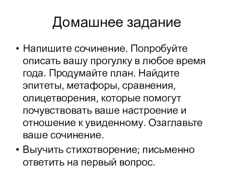 Домашнее заданиеНапишите сочинение. Попробуйте описать вашу прогулку в любое время года. Продумайте план. Найдите эпитеты, метафоры, сравнения,
