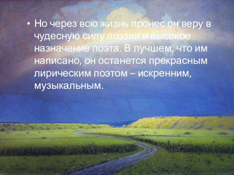 и высокое назначение поэта. В лучшем, что им написано, он останется прекрасным лирическим поэтом – искренним, музыкальным.