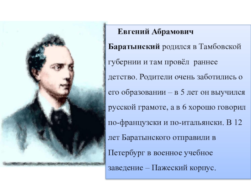 Слайд 10Евгений Абрамович Баратынский родился в Тамбовской губернии и там провёл раннее