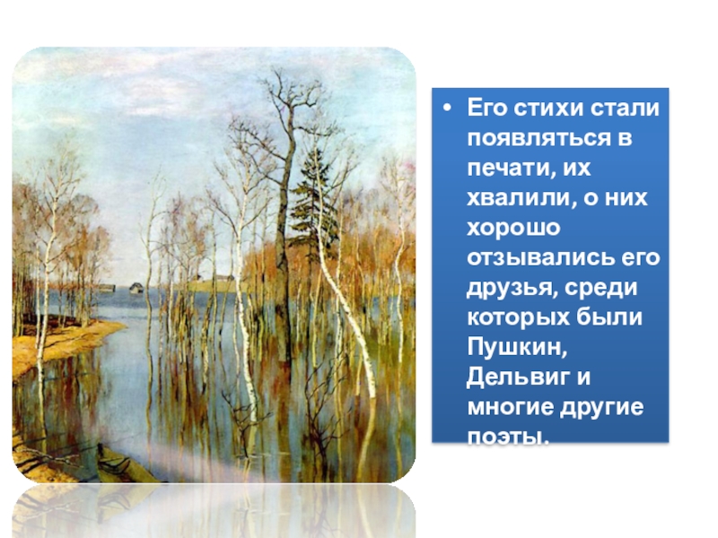 числу отличных наших поэтов». Много стихотворений он посвятил русской природе, которую хорошо знал и любил с детских лет.