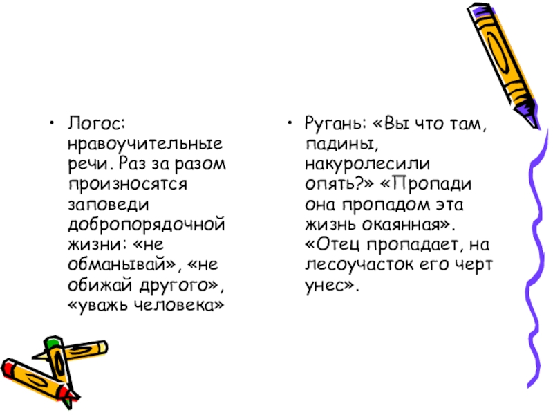 Ругань: «Вы что там, падины, накуролесили опять?» «Пропади она пропадом эта жизнь окаянная». «Отец пропадает, на лесоучасток его черт унес».