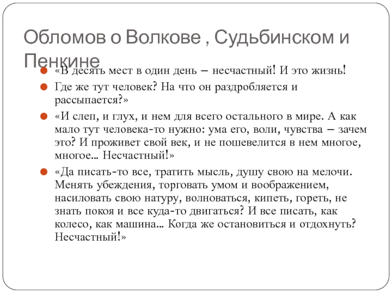 Слайд 14Обломов о Волкове , Судьбинском и Пенкине
