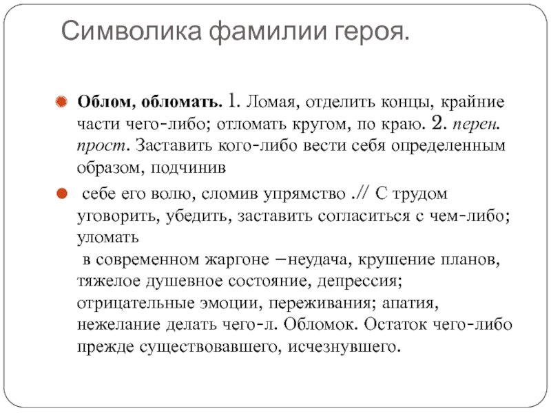в современном жаргоне –неудача, крушение планов, тяжелое душевное состояние, депрессия; отрицательные эмоции, переживания; апатия, нежелание делать чего-л. Обломок. Остаток чего-либо прежде существовавшего, исчезнувшего.