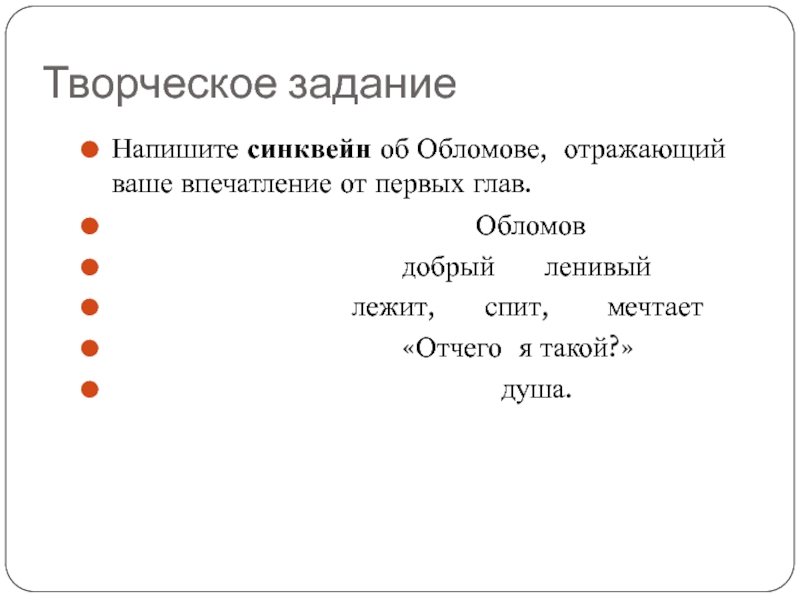 Напишите синквейн об Обломове, отражающий ваше впечатление от первых глав.