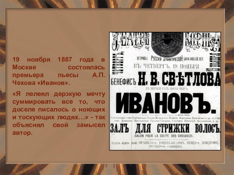 Стоят: А.П. Чехов, В.Н. Давыдов (первый исполнитель роли Иванова). Сидят: А.С. Суворин, П.М. Свободин