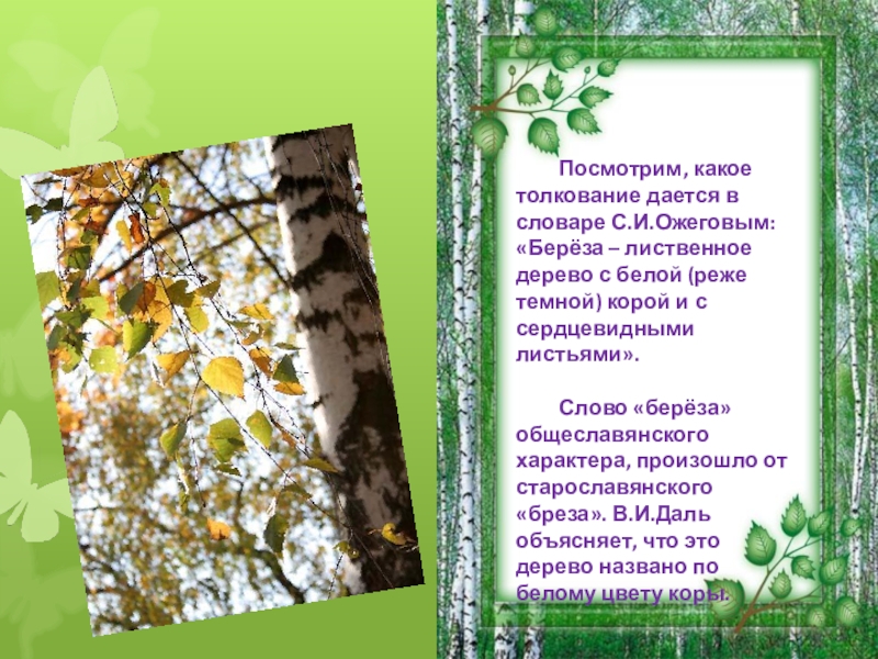 Слайд 6Посмотрим, какое толкование дается в словаре С.И.Ожеговым: «Берёза – лиственное дерево