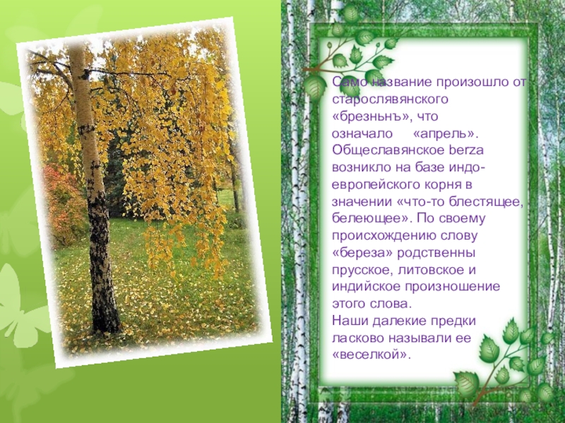 Слово «берёза» общеславянского характера, произошло от старославянского «бреза». В.И.Даль объясняет, что это дерево названо по белому цвету коры.