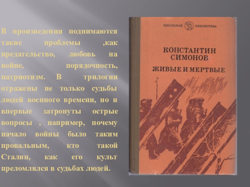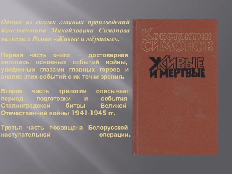 Слайд 8Одним из самых главных произведений Константина Михайловича Симонова является Роман «Живые