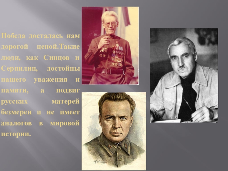 Слайд 17Победа досталась нам дорогой ценой.Такие люди, как Синцов и Серпилин, достойны