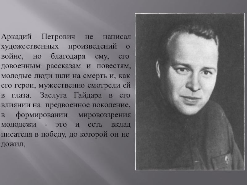 его довоенным рассказам и повестям, молодые люди шли на смерть и, как его герои, мужественно смотрели ей в глаза. Заслуга Гайдара в его влиянии на предвоенное поколение, в формировании мировоззрения молодежи - это и есть вклад писателя в победу, до которой он не дожил.