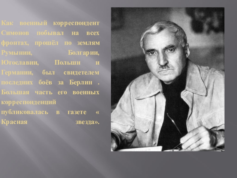Слайд 7Как военный корреспондент Симонов побывал на всех фронтах, прошёл по землям