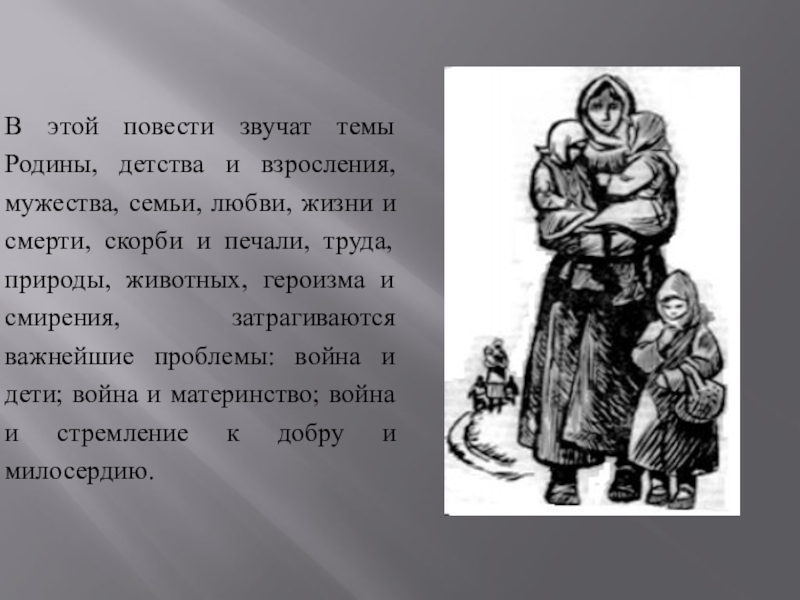 любви, жизни и смерти, скорби и печали, труда, природы, животных, героизма и смирения, затрагиваются важнейшие проблемы: война и дети; война и материнство; война и стремление к добру и милосердию.
