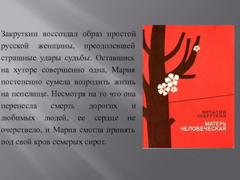 Слайд 14Закруткин воссоздал образ простой русской женщины, преодолевшей страшные удары судьбы. Оставшись