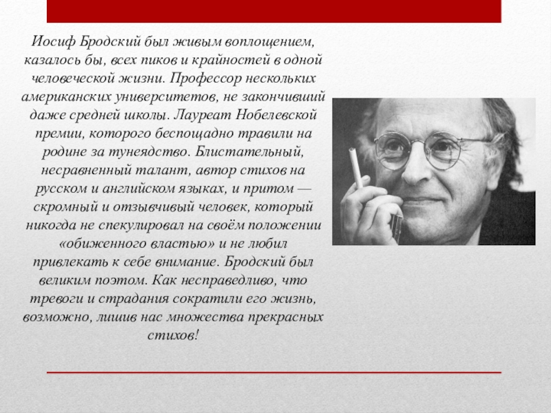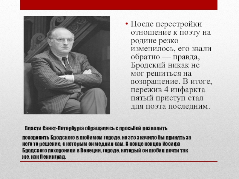 После перестройки отношение к поэту на родине резко изменилось, его звали обратно — правда, Бродский никак не мог решиться на возвращение. В итоге, пережив 4 инфаркта пятый приступ стал для поэта последним.