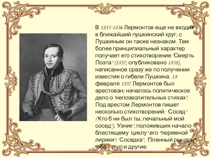 Пушкиным он также незнаком. Тем более принципиальный характер получает его стихотворение "Смерть Поэта" (1837; опубликовано 1858), написанное сразу же по получении известия о гибели Пушкина. 18 февраля 1837 Лермонтов был арестован; началось политическое дело о "непозволительных стихах". Под арестом Лермонтов пишет несколько стихотворений: "Сосед" ("Кто б ни был ты, печальный мой сосед"), "Узник", положивших начало блестящему "циклу" его "тюремной лирики": "Соседка", "Пленный рыцарь" (оба - 1840) и другие.