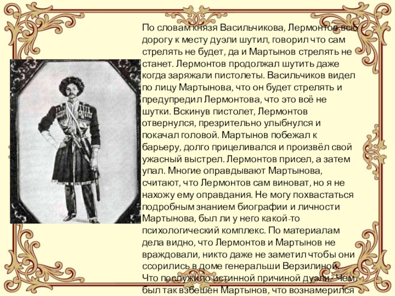 говорил что сам стрелять не будет, да и Мартынов стрелять не станет. Лермонтов продолжал шутить даже когда заряжали пистолеты. Васильчиков видел по лицу Мартынова, что он будет стрелять и предупредил Лермонтова, что это всё не шутки. Вскинув пистолет, Лермонтов отвернулся, презрительно улыбнулся и покачал головой. Мартынов побежал к барьеру, долго прицеливался и произвёл свой ужасный выстрел. Лермонтов присел, а затем упал. Многие оправдывают Мартынова, считают, что Лермонтов сам виноват, но я не нахожу ему оправдания. Не могу похвастаться подробным знанием биографии и личности Мартынова, был ли у него какой-то психологический комплекс. По материалам дела видно, что Лермонтов и Мартынов не враждовали, никто даже не заметил чтобы они ссорились в доме генеральши Верзилиной. Что послужило истинной причиной дуэли? Чем был так взбешен Мартынов, что вознамерился убить поэта? Лермонтов ясно дал понять, что стрелять не будет, тем не менее Мартынов спустил курок...