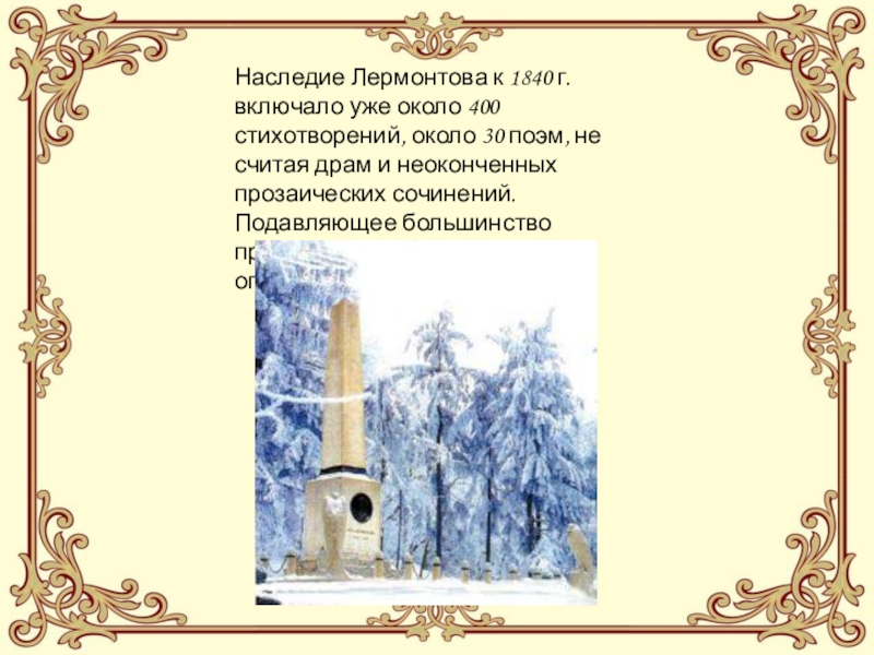 Слайд 18Наследие Лермонтова к 1840 г. включало уже около 400 стихотворений, около