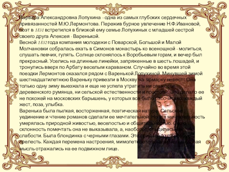 Слайд 22Варвара Александровна Лопухина - одна из самых глубоких сердечных привязанностей М.Ю.Лермонтова.