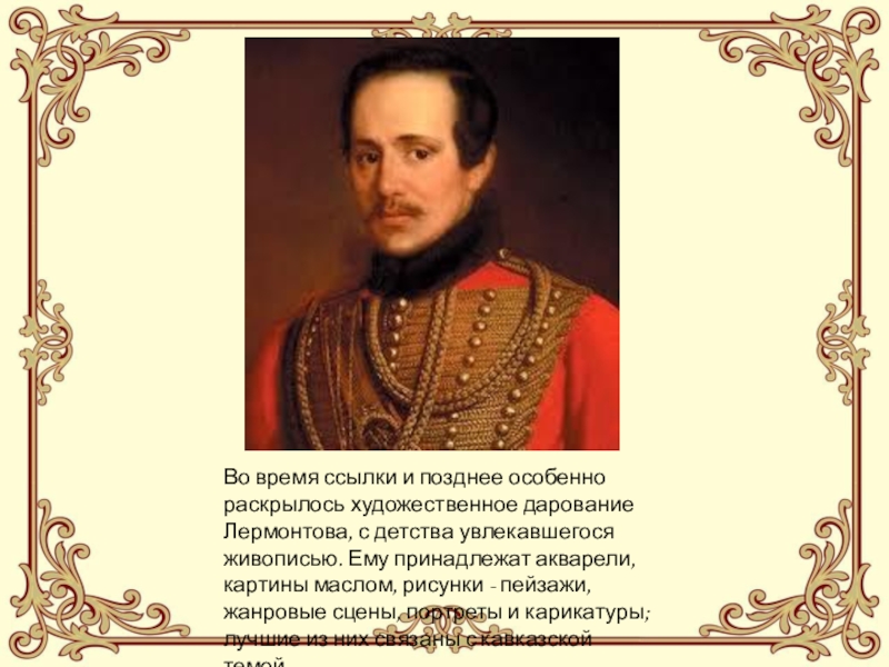 Слайд 16Во время ссылки и позднее особенно раскрылось художественное дарование Лермонтова, с