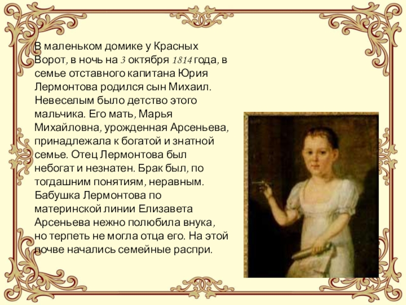 1814 года, в семье отставного капитана Юрия Лермонтова родился сын Михаил. Невеселым было детство этого мальчика. Его мать, Марья Михайловна, урожденная Арсеньева, принадлежала к богатой и знатной семье. Отец Лермонтова был небогат и незнатен. Брак был, по тогдашним понятиям, неравным. Бабушка Лермонтова по материнской линии Елизавета Арсеньева нежно полюбила внука, но терпеть не могла отца его. На этой почве начались семейные распри.