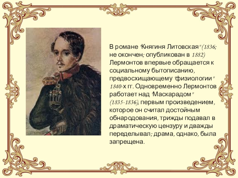 Слайд 13В романе "Княгиня Литовская" (1836; не окончен; опубликован в 1882) Лермонтов
