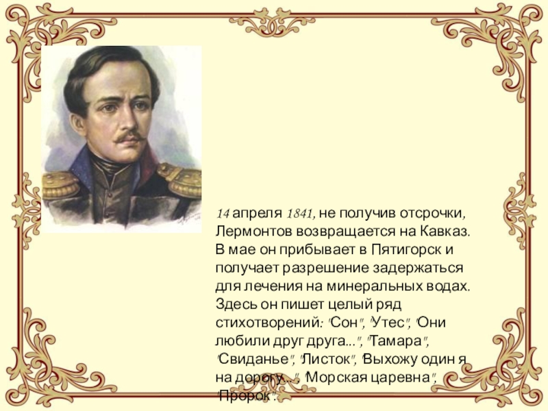 Слайд 1914 апреля 1841, не получив отсрочки, Лермонтов возвращается на Кавказ. В