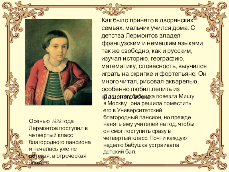 Осенью 1828 года Лермонтов поступил в четвертый класс благородного пансиона и началась уже не детская, а отроческая эпоха