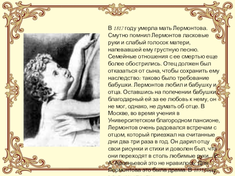 Слайд 7В 1817 году умерла мать Лермонтова. Смутно помнил Лермонтов ласковые руки