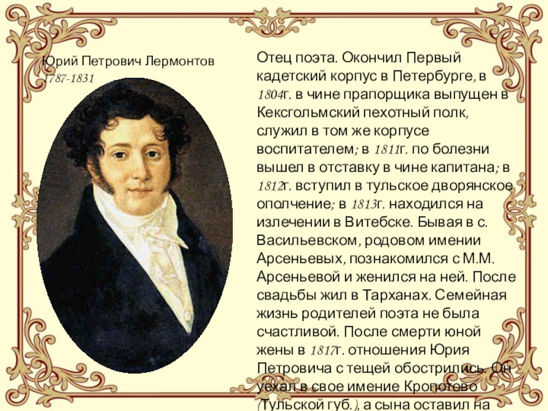 чине прапорщика выпущен в Кексгольмский пехотный полк, служил в том же корпусе воспитателем; в 1811г. по болезни вышел в отставку в чине капитана; в 1812г. вступил в тульское дворянское ополчение; в 1813г. находился на излечении в Витебске. Бывая в с.Васильевском, родовом имении Арсеньевых, познакомился с М.М.Арсеньевой и женился на ней. После свадьбы жил в Тарханах. Семейная жизнь родителей поэта не была счастливой. После смерти юной жены в 1817г. отношения Юрия Петровича с тещей обострились. Он уехал в свое имение Кропотово (Тульской губ.), а сына оставил на воспитание бабушке согласно условию, поставленному ею в завещании.
