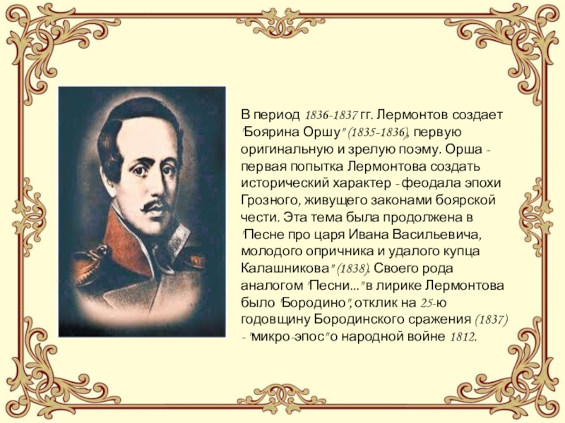 и зрелую поэму. Орша - первая попытка Лермонтова создать исторический характер - феодала эпохи Грозного, живущего законами боярской чести. Эта тема была продолжена в "Песне про царя Ивана Васильевича, молодого опричника и удалого купца Калашникова" (1838). Своего рода аналогом "Песни..." в лирике Лермонтова было "Бородино", отклик на 25-ю годовщину Бородинского сражения (1837) - "микро-эпос" о народной войне 1812.