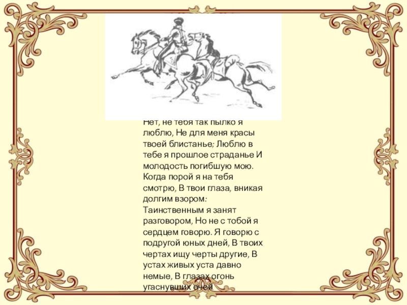 твоей блистанье; Люблю в тебе я прошлое страданье И молодость погибшую мою. Когда порой я на тебя смотрю, В твои глаза, вникая долгим взором: Таинственным я занят разговором, Но не с тобой я сердцем говорю. Я говорю с подругой юных дней, В твоих чертах ищу черты другие, В устах живых уста давно немые, В глазах огонь угаснувших очей.