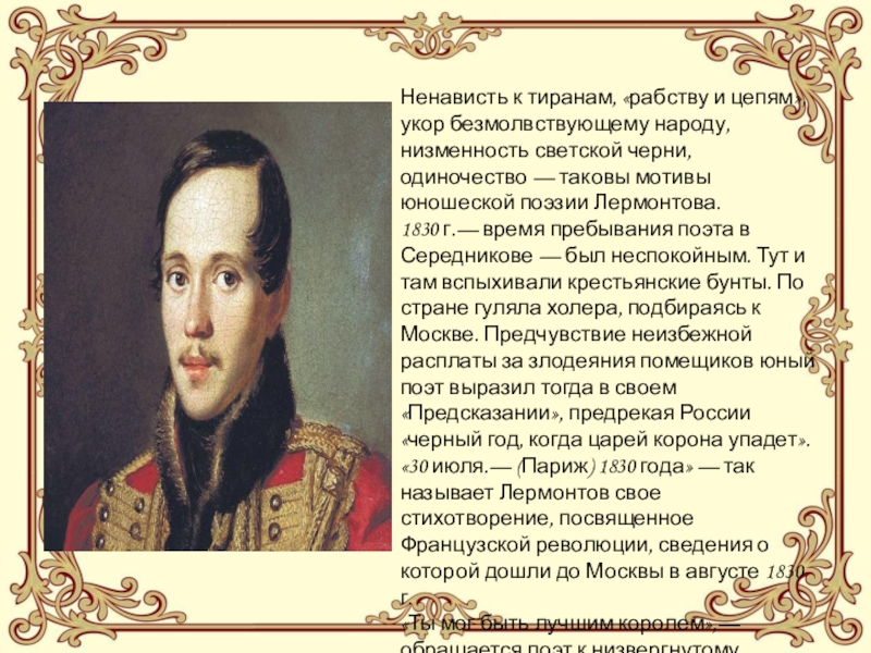 1830 г.— время пребывания поэта в Середникове — был неспокойным. Тут и там вспыхивали крестьянские бунты. По стране гуляла холера, подбираясь к Москве. Предчувствие неизбежной расплаты за злодеяния помещиков юный поэт выразил тогда в своем «Предсказании», предрекая России «черный год, когда царей корона упадет».